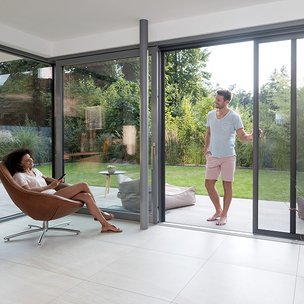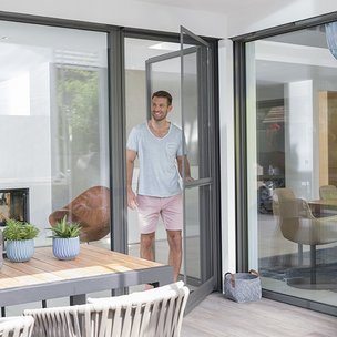 Schiebetüren kommen zum Einsatz, wenn breite Fensterfronten, wie Hebe-Schiebetüren, mit Insektengittern versehen werden sollen. Das Element ist im geschlossenen Zustand nahezu unsichtbar.