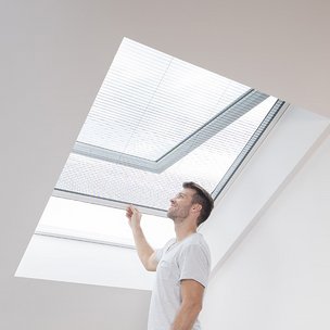Grenzenlose Freiheit versprechen unser Rollo-System für Ihre Fenster bei einer Dachschräge: Fenster auf, Rollo zuziehen und die frische Brise ungestört genießen. Beim Schließen läuft das Rollo stabil und sicher in seitlichen Schienen auf und zu. Wird das Rollo nicht gebraucht, gleitet es gebremst leise in seine Kassette zurück und verschwindet bis zum nächsten Gebrauch. Mit unserem dezenten Rollo-System schützen Sie ideal Ihre Wohndachfenster. Dabei können Sie, je nach Variante, das gesamte Element komplett mit einem Handgriff entfernen, um beispielsweise Ihre Fenster zu reinigen.