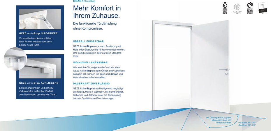 Zum Einsatz zu Hause oder im Büro. Mit vollen Händen kann man die Tür in eine Richtung – ohne den Türdrücker betätigen zu müssen – öffnen. Der Türdämpfer stoppt die Tür in der vorher eingestellten Position ohne einen Türstopper und schützt somit die Wand. Beim Schließen bremst Geze ActiveStop die zuknallende Tür und schließt sie selbständig leise und sanft. So bleiben die (Kinder-)Finger gesund. Auch Zum Nachrüsten geeignet.