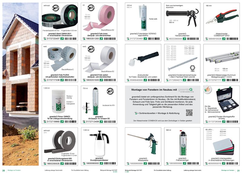 Auf einer Doppelseite alles für die Fenstermontage – vom Fugendichtband bis zur Wasserwaage.
